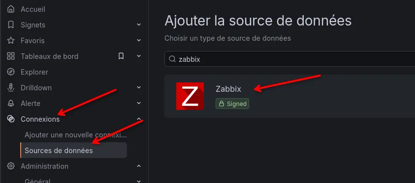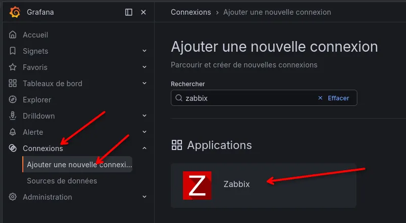 Section titled “Liaison de Grafana à ZABBIX”Dans l’onglet “Connexion”, ajouter Zabbix :