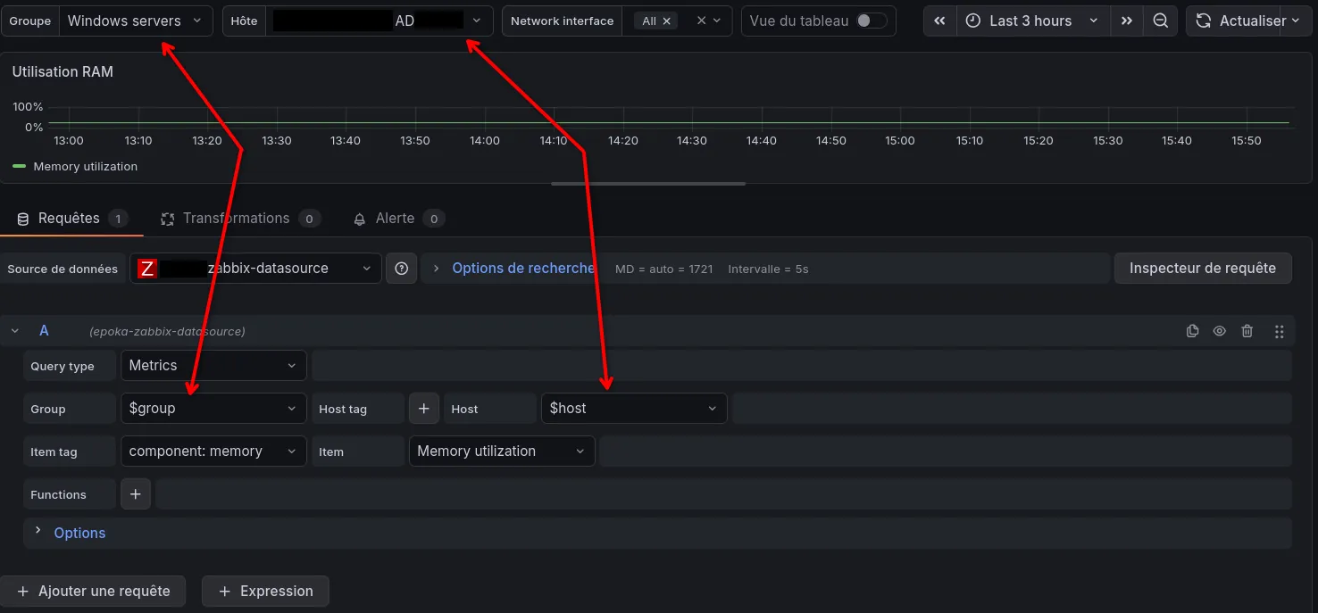 Ceci nous permettra de sélectionner les variables dans les requêtes afin d’avoir des graphique adaptatif à l’élément, comme ici pour le graphique d’utilisation de la RAM :