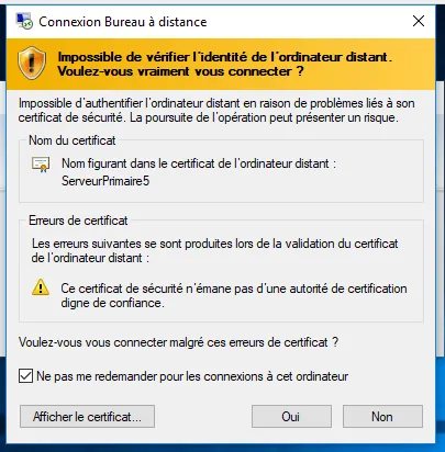 Section titled “Se connecter au serveur”Saisissez l’adresse IP ou le nom du serveur puis cliquez sur Connexion. Acceptez le certificat de sécurité lorsqu’il est demandé :